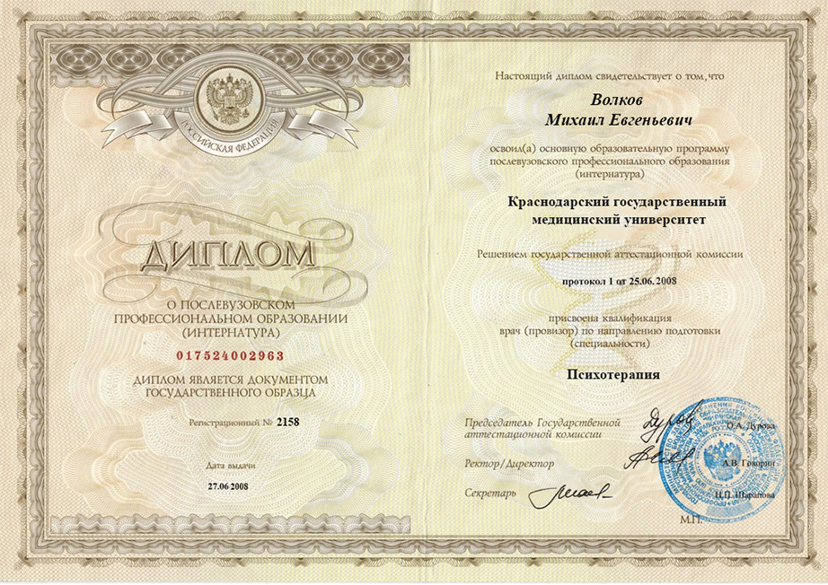 Михаил Евгеньевич Волков — главный врач и высококвалифицированный эксперт в области наркологии и психотерапии. Окончил Краснодарский государственный медицинский университет в 2003 году, получив диплом по специальности «Лечебное дело». В 2006 году окончил ординатуру, а следом в 2008 году получил диплом интернатуры по Психотерапии. В 2012 году прошел переподготовку по Наркологии.